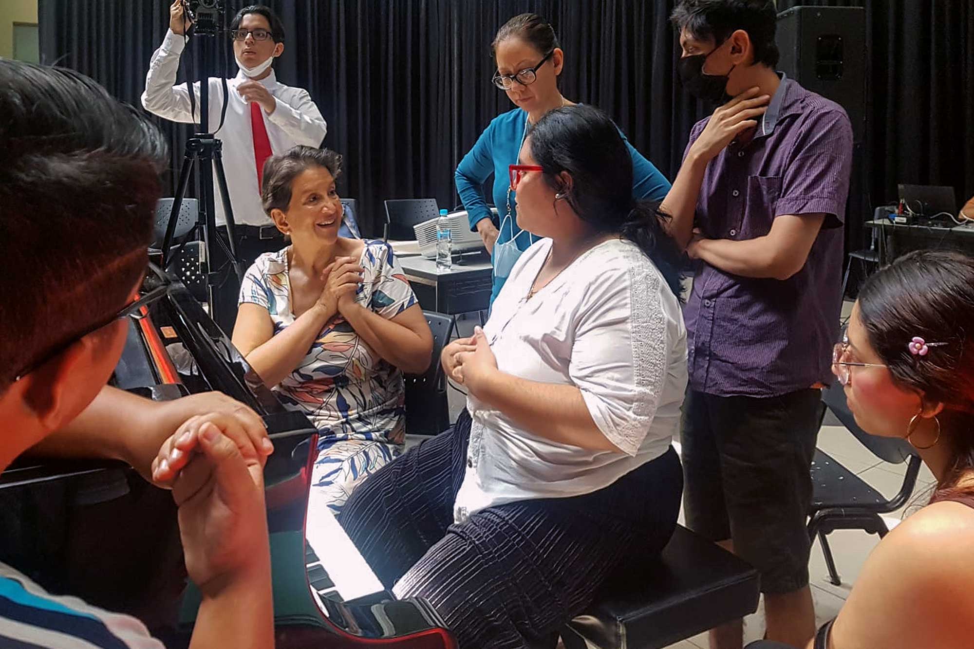 La participación de Pilar Leyva en Piano ma non solo no es reciente. Estuvo en las ediciones 2019 y 2020. Indicó estar agradecida con la UArtes por invitarla. Los ecuatorianos son un encanto, anotó la docente que reveló viajar mucho. En Bogotá imparte la cátedra de piano desde hace 20 años en la Universidad de Corpas. También trabaja de manera virtual, mucho antes de la pandemia. Sus alumnos son de diferentes países. En la imagen principal, la maestra Pilar Leyva con los estudiantes de la Escuela de Artes Sonoras: Maria Daniela Sornoza (izq.), Odalys Palacios, Ángela Izurieta y Daniel Terraces. Estuvieron también en el taller los docentes Zoila Cevallos y Miguel Gallardo.