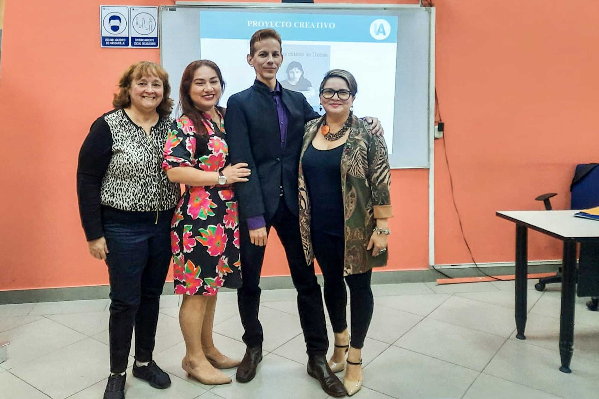A su proyecto lo tituló “Porque los chicos no lloran” y es una novela breve de formación que retrata la normalización de la violencia de género y el abuso de menores. Ambientada en un escenario rural con trasfondo bélico, la obra narra una opresión patriarcal y práctica misógina que vulnera a sus víctimas mental y físicamente, con justificaciones de supremacía machista. El jurado de tesis lo integraron las docentes Solange Rodríguez, Maritza Cino y Siomara España, su tutora. Demian tuvo 25 minutos para exponer acerca del contexto social, los antecedentes y la metodología de su trabajo final.