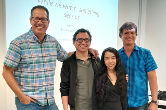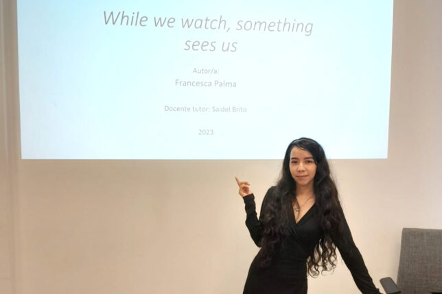 En recientes semanas, Francesca Palma defendió su trabajo final de tesis al que tituló “While we watch something sees us”, logrando 10 en todo. En diálogo con InfoUArtes, y haciendo memoria de los inicios de su carrera universitaria, revela que su decisión de estudiar Artes Visuales en la UArtes se basó en su temprano interés por el dibujo y las artes, respaldado por el apoyo de su familia. La universidad ofrecía una oportunidad de formación integral y profesional en un campo que le apasionaba y la tomó.