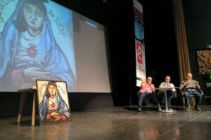 La primera jornada del congreso cerró con la presentación artística “La Dolorida de Bucay” de Hernán Zúñiga y Trilce Zúñiga. “Se tomó el lobby del MAAC”, reseñó la institución en sus redes sociales y detalló: La serigrafía es una técnica milenaria que ha evolucionado con el tiempo, emerge como un poderoso medio para plasmar las narrativas y la memoria colectiva de la sociedad. Una mesa, pinturas y en una pantalla de impresión serigráfica la imagen de su obra “La dolorida de Bucay”, que en 1994 fue censurada.