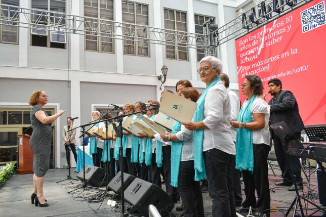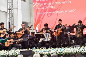 En la sesión solemne hubo también presentaciones artísticas. Primero, de la Orquesta de Cámara y Rondalla, ambas de la Escuela de Artes Sonoras, integrada por sus estudiantes y a cargo de Andrey Astaiza, su director. “Ángel de luz” y “Reír llorando” fueron los temas que se interpretaron –en las voces de Sarah Barriga, Nathalia Villacres, Irene Rodríguez y María José Carbo– y que dieron paso a la entrega de placas de reconocimiento al personal de la UArtes, seguida por las intervenciones de los docentes Amalina Bomnin y Andrés Landázuri, y de la administrativa Emilia Moreno, fundadores de la universidad.