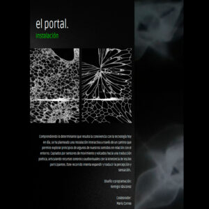 “El portal”, en cambio, partió de la comprensión de lo determinante que resulta la convivencia con la tecnología hoy en día y se planteó una instalación interactiva a través de un camino que permitió explorar principios de algunos de nuestros sentidos en relación con el entorno. Captados por sensores de movimiento y volcados hacia una traducción poética, articulando recursos sonoros y audiovisuales con la kinestecia de los/las participantes. Un recorrido que intenta expandir y traducir la percepción y sensación. Su diseño y programación los realizó Remigio Vásconez, con la colaboración de Mario Correa.