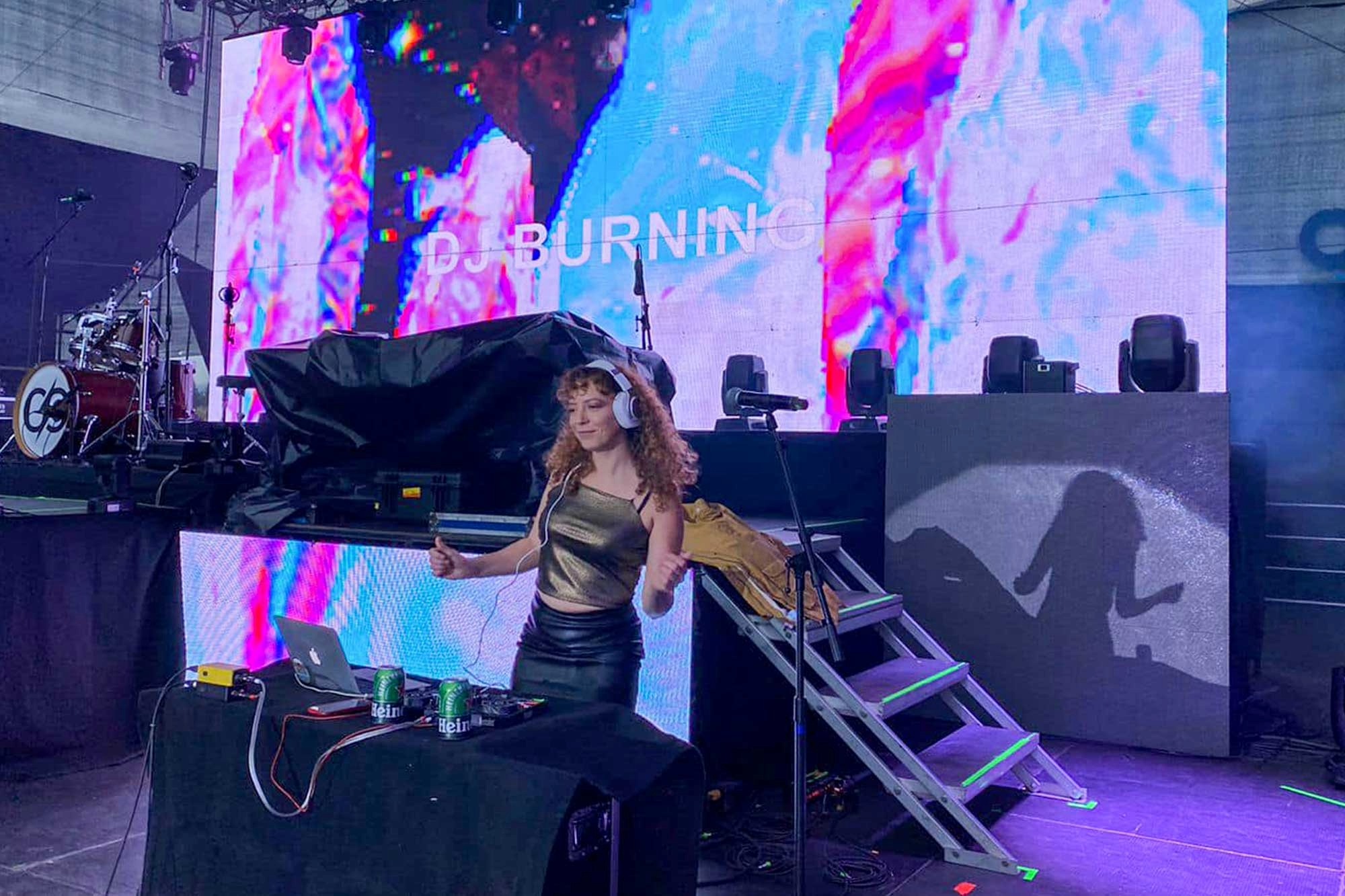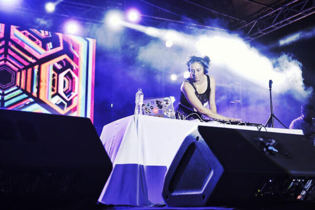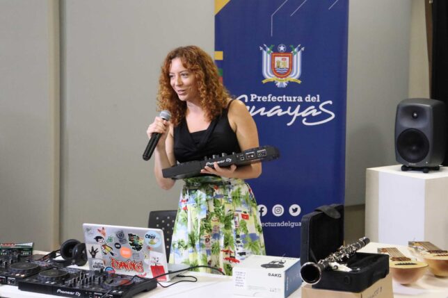 En las imágenes, la productora y compositora musical Bernarda Ubidia, docente de la EAS, en varias actividades cumplidas en la UArtes en el ámbito académico y también artístico.
