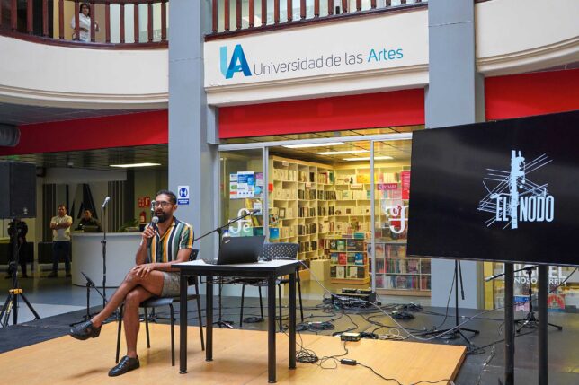 Seguidamente, en la misma Plaza Pública del MZ14 tuvo lugar en la jornada inaugural la charla “El Nodo: creando Universos Sonoros”, con Peter Ronquillo, diseñador, artista escénico, investigador de las estéticas espaciales, el movimiento y la ciudad, cuyos estudios en Arquitectura y Danza Clásica-Contemporánea lo llevan a una serie de búsquedas desde la transformación del espacio hasta el trabajo transdisciplinar.