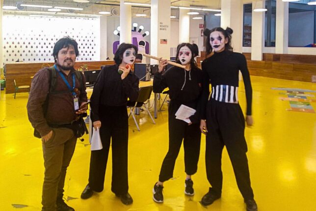 Keyla Maldonado, Hithler Burgos y Sharmila Ulloa, estudiantes de la Escuela de Artes Escénicas, dieron vida a un juglar, un bufón y un trovador para recorrer con niños de la Fundación Children International las instalaciones de la Biblioteca de las Artes. El proyecto fue parte de las horas de vínculo de lxs alumnxs UArtes, quienes, con la dirección del docente Juan Bautista, pusieron en práctica: formación de públicos, mediación lectora y representación teatral.