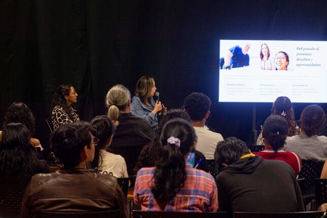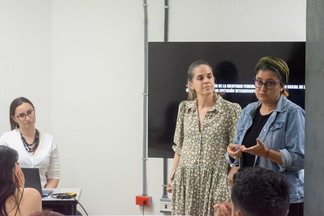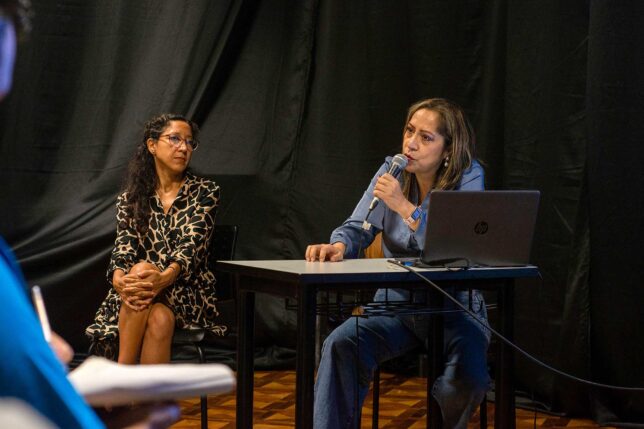 Aguirre expuso la metodología de investigación-creación implementada en el Centro de Rehabilitación Social Femenino Guayas y en el Centro de Adolescentes Infractores Varones de Guayaquil durante dos años. En este espacio se compartieron las experiencias y los procesos creativos que desembocaron en el diseño de un sistema colaborativo de producción artística enfocado al cine documental y la fotografía, donde mujeres y adolescentes privadas de libertad crearon varias obras junto a estudiantes de la carrera de Cine de la UArtes.