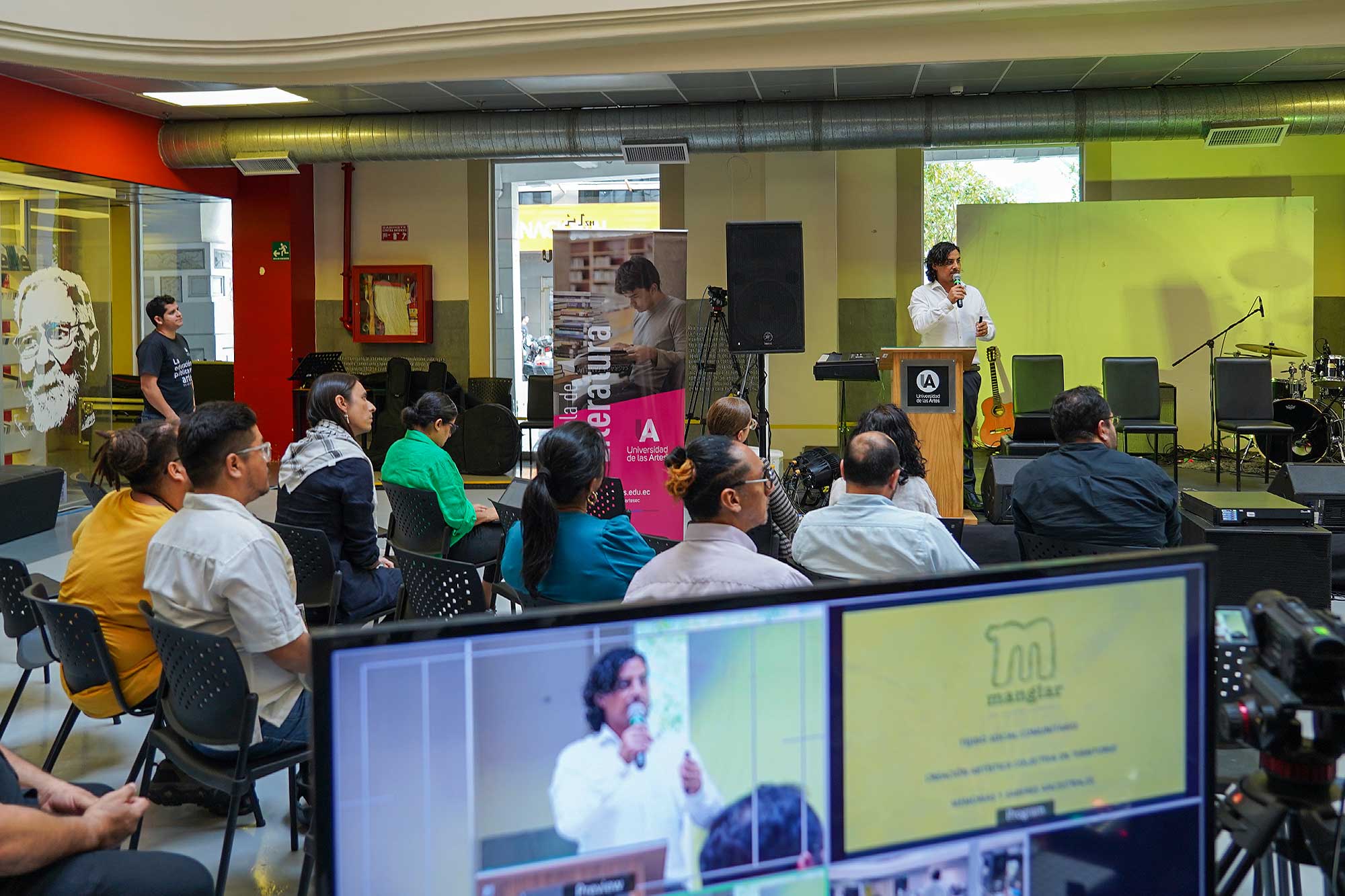 La inauguración de Manglar se hizo en la Plaza Pública del MZ14 Centro de Producción e Innovación UArtes y contó con la participación del rector William Herrera, de los vicerrectores Olga López y Bradley Hilgert, de la directora de la Escuela de Literatura, Alejandra Zambrano, de docentes, estudiantes, funcionarios y público en general. Byron Cevallos, coordinador de la carrera de Educación Artística Intercultural, inició la presentación de la cita mencionando sus actividades y los debates que se tendrían en torno al espacio público, las artes y la educación.