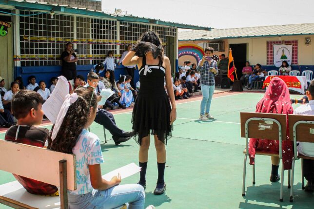 “Trabajamos con niños y niñas de 9 a 11 años, explorando sus imaginarios y poéticas propias. Como resultado, se crearon pequeñas micropiezas teatrales basadas en leyendas autóctonas de Guayaquil. Los niños escribieron sus propios guiones y también participaron en la creación de la escenografía. Este proyecto busca integrar la diversidad de senti-pensares de niñxs con y sin diversidad funcional a través de una muestra artística que refleje dicho proceso pedagógico”, anotó Banda.