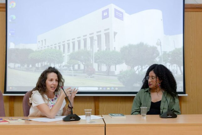 Fotos: tomadas del sitio web de Universidad de La Laguna. Constan Yuliana Ortiz durante su intervención y junto a Paula Fernández, codirectora del curso, así también una gráfica de Katya Vázquez Schröder, igualmente codirectora del evento.