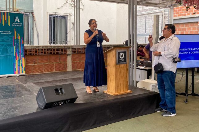 En la primera ronda de las entidades receptoras intervinieron los representantes de Kolectivoz, del Instituto Superior Tecnológico Guayaquil (ISTG), del Consejo de Participación Ciudadana y Control Social (CPCCS), de la ESPOL Cultural y del Teatro Gestus, cada uno indicando de sus actividades y proyectos, así como su relacionamiento con la UArtes. Fue el caso del CPCCS que ponderó el trabajo de vinculación con la sociedad desarrollado con nuestros estudiantes; este corresponde a Ánima, que dirige el docente Jorge Tigrero, el cual ha desarrollado productos artísticos-pedagógicos como material de apoyo para difundir deberes y derechos ciudadanos.