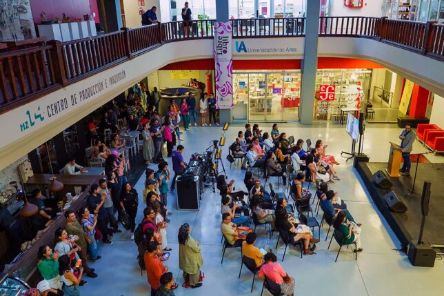 A medida en que Universidad de las Artes fue incorporando otros espacios, como la Biblioteca de las Artes y el MZ14 Centro de Producción e Innovación, la feria de editoriales independientes se fue desplazando a las veredas de la calle Aguirre y Pichincha e incluso hasta esta Plaza Pública, donde lo tuvimos el año pasado “y mientras los libros iban ocupando estos espacios, se sumaban los esfuerzos de colegas como Alejandra Zambrano y Camila Carrillo”.