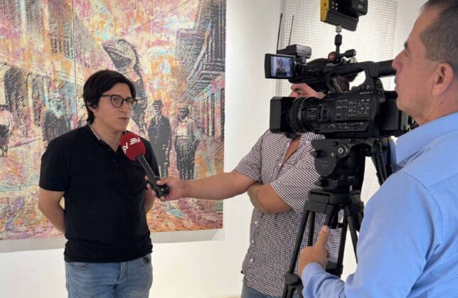 Fotos: Ricardo Bohórquez y galería Casa del Barrio. Las imágenes corresponden a las obras que forman parte de “La superficie de lo imprevisible”; consta también el artista siendo entrevistado por un medio de comunicación local.