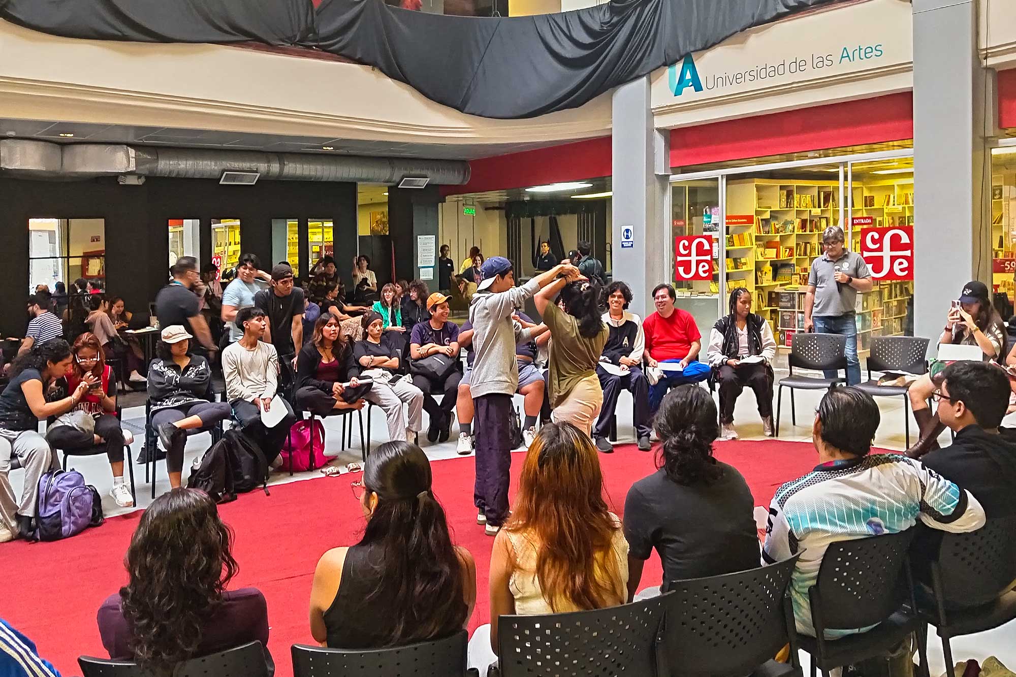 Todos estudiantes de la Universidad de las Artes, pero no todos se conocían, pues pertenecen a varios semestres, carreras y escuelas. No obstante, respondieron en conjunto a la invitación de participar en el “Ejercicio de vínculo N˚ 4: Transferencia emocional”, propuesto por el docente y artista Ruslán Torres, director de la Escuela de Artes Visuales.