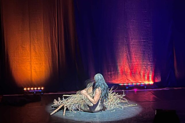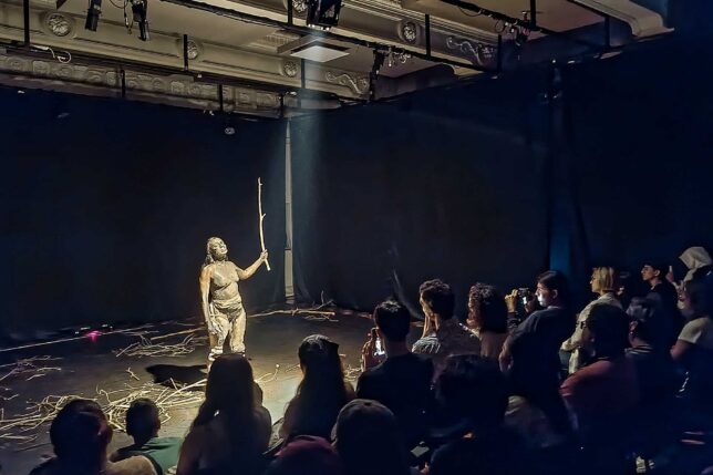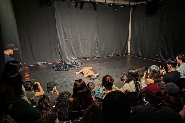 Texto: Carmen Cortez/Dircom. En imágenes, los estudiantes que participaron en el taller con Ángela Bello en la presentación de resultados; las siguientes gráficas corresponden a la puesta en escena de la obra “Tiresias o la razón del ser”, un solo de la artista colombiana, invitada a Inter[•]actos por la Escuela de Artes Escénicas.
