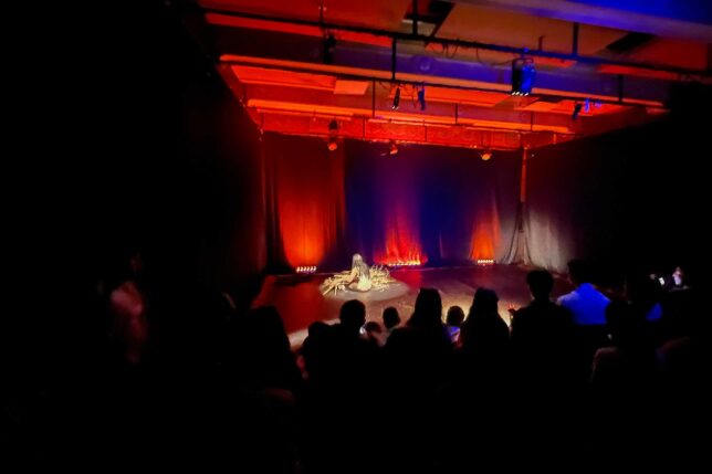 Además de Cortocinesis, la artista invitada por la Escuela de Artes Escénicas UArtes para los Inter[•]actos trabaja como intérprete en la Compañía de Danza L’Explose, cuya trayectoria data de hace 30 años. La dirigió el coreógrafo español Tino Fernández, quien se radicó en Colombia y falleció en 2020. El solo “Tiresias o la razón del ser” que Ángela Bello presentó la tarde/noche de hoy, jueves 17, en el Salón Patrimonial del MZ14 es una producción suya.