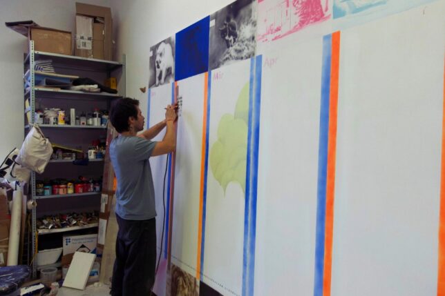 El artista habla de abordar la pintura como simulacro. Al hacerlo sitúa, además, una postura recelosa con respecto a la pintura dentro del engranaje comercial del mundo del arte, lo que supone una vuelta de tuerca adicional a la larga tradición de crítica institucional en tiempos del capitalismo tardío y de la hipertrofia de imágenes que satura nuestro presente. (…) Al hacer un paneo por la sala notamos cómo el sentido último de su trabajo no reside en ninguna obra específica, sino en el acto en sí de la engañosamente espontánea acumulación de elementos representados.