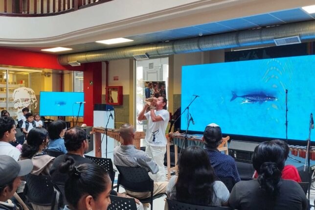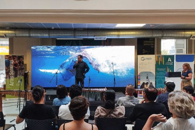 Traer un poco del mar a la ciudad. Fue una iniciativa colectiva que derivó en la presentación de “Sinfonía de Ballenas”, un evento réplica del festival homónimo que se desarrolló –el 12 de julio pasado– en la playa de Ayangue, provincia de Santa Elena. En Guayaquil, la actividad tuvo lugar este 8 de agosto en la Plaza Pública del MZ14 Centro de Producción e Innovación de la Universidad de las Artes.