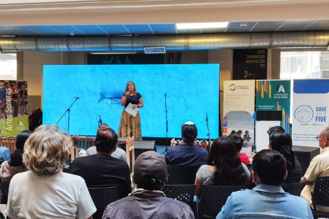 En la “Sinfonía de Ballenas” desarrollada en la Plaza Pública del MZ14, el primero en intervenir fue Manuel Rodríguez, miembro de la Asociación de Arte y Cultura de la comunidad de Montañita, quien compartió un ritual de conexión con los ancestros. Tras agradecer la invitación a un espacio que señaló como relevante para lo que se está realizando con la conservación de los océanos, tocó el churo en las siete direcciones, que es como los ancestros de los pueblos originarios.