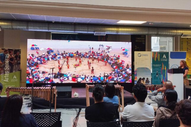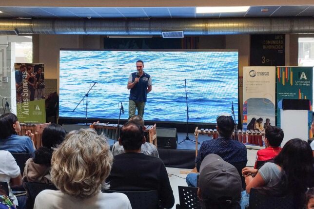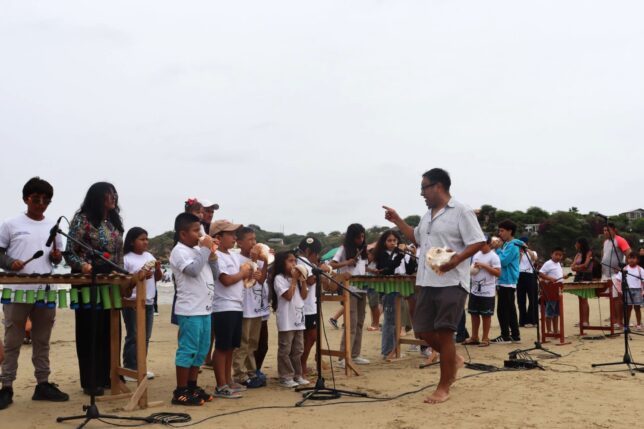 Así mismo, con el apoyo de la FADO y miembros de la comuna santaelenense, Andrey Astaiza trabajó con niñas y niños de Ayangue para la conformación del Ensamble de Caracolas y Marimba, que codirige el también docente Orlin Montaño, y para el diseño de un paisaje sonoro y una instalación sonora con registros de audio de ballenas. Eso último a cargo del docente Juan José Ripalda. Los resultados se mostraron en el evento.