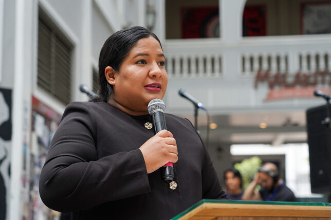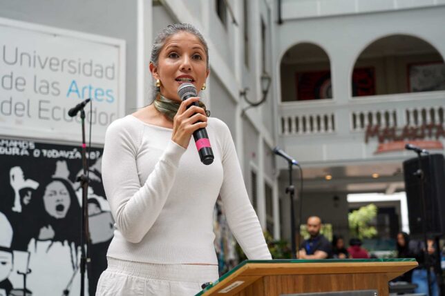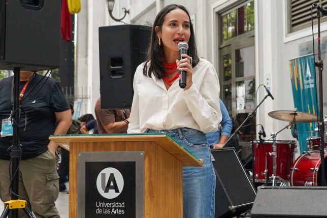 Este espacio busca generar oportunidades para que más chicas y chicos encuentren en las artes un camino profesional con futuro y con sentido, anotó poniendo a la Universidad de las Artes como una prueba de ello. Es una institución que cumplió 10 años y desde que está en Guayaquil ha inspirado a generaciones a construir desde la cultura y para la cultura y ha animado y dado una vida importante al centro de esta ciudad, dijo la ministra, quien como educadora expresó que el acceso a una formación cultural de calidad transforma vidas, siendo ella misma parte de esa transformación. “El arte nos enseña a pensar, cuestionar e imaginar otros futuros posibles”.