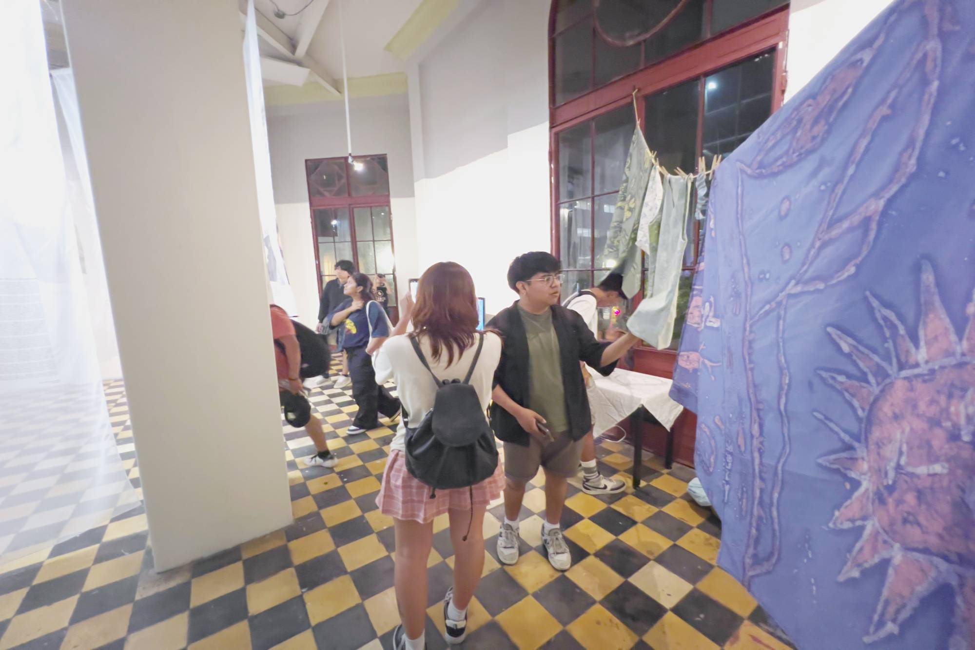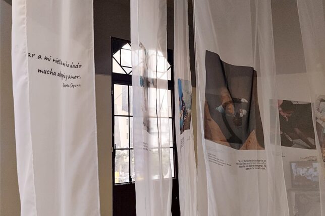 La muestra se inauguró en el Project Room del MZ14 Centro de Producción e Innovación UArtes y, como detalla en el texto de sala la curadora María José Machado, se trata de una instalación inmersiva que se asemeja a una bitácora, a un diario colectivo que conjuga el registro de campo con la política del arte. “En ella se entrelazan remanentes, objetos tejidos y memorias. Las fotografías y los textos impresos en tela no son un detalle estético fortuito, responden a la intención de acercar la materialidad de los talleres de batik: telas, rebozos, pañales, vestuarios y objetos aportados por las comunidades, se convierten en soportes y lenguajes”.