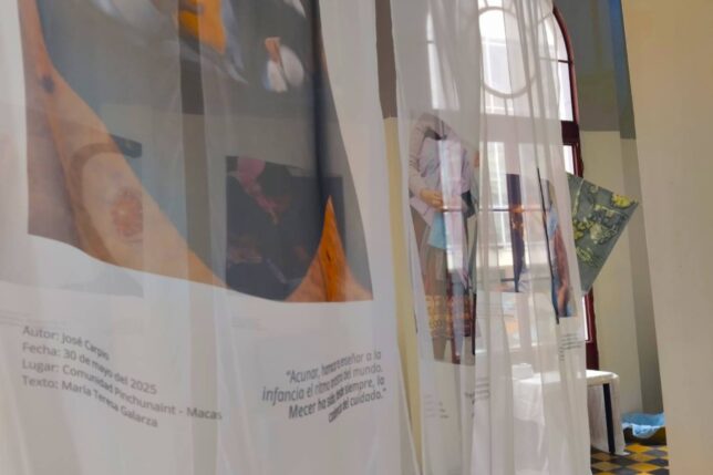 La curadora agrega que el relato que se despliega en la exposición se articula alrededor de tres núcleos: el cuidado como práctica estética y política, la memoria como tejido y la interculturalidad como horizonte. El cuidado se manifiesta en los gestos cotidianos de maternidades diversas –madres kichwas, afroecuatorianas, mestizas– que sostienen la vida desde la memoria y la esperanza (paráfrasis del proyecto). La memoria se corporiza en canciones, consejos heredados, objetos y textiles que se convierten en ofrendas transmitidas de generaciones en generación. La interculturalidad, finalmente, convoca a mirar de frente y con ternura la diferencia, fomentando el intercambio de saberes y celebrando la pluralidad de formas en que se organiza el cuidado en Ecuador y la región.