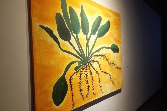 Lo experimentado ha sido como buscar ese estar presente en su vida diaria en general y consigo. Eso se empezó a traducir en las pinturas de “Imaginario Tropical” o en las colaboraciones que tiene la muestra. Especifica que son dos pinturas de acrílico y dos cuadros de madera con pintura spray las que reflejan ese retorno a los inicios. “Las dos pinturas, grandes y a gran escala, son el acrílico con el que empecé a pintar a mis 14 años y esas manifestaciones recogen o reflejan aquello que ya había transitado”.