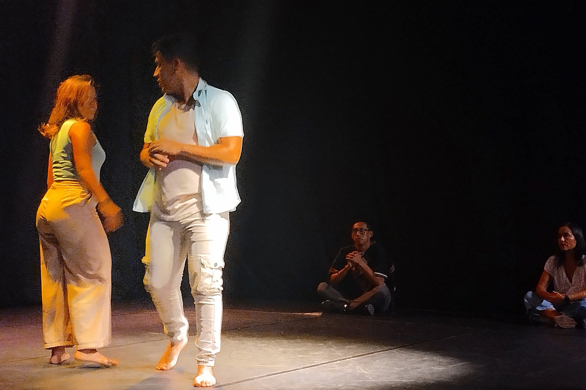 Vale anotar que, casi al término de la puesta en escena, Camacho y Olvera invitaron a los presentes, en su mayoría docentes de la carrera de Danza y de Creación Teatral, a acompañarlos en un cierre expresivo que llevó a todos a mover sus cuerpos en un compás de necesidades expresivas.