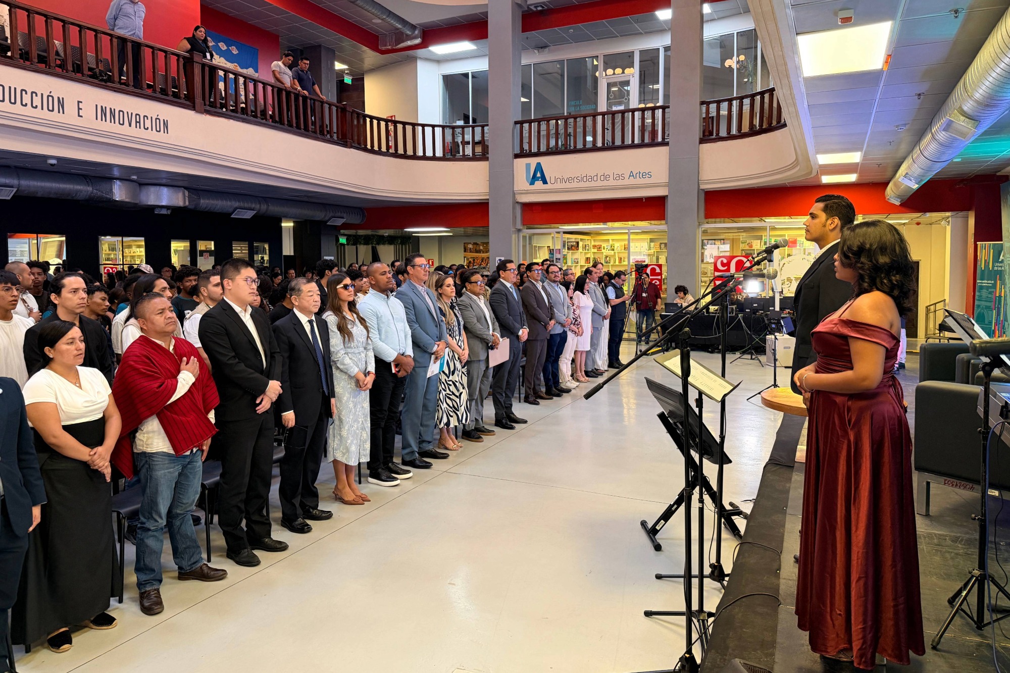 Al inicio y al final del acto se interpretaron en ese orden los himnos del Ecuador y Guayaquil; estuvo a cargo de los estudiantes de Producción Musical y Sonora, Vanessa Farías y Cristian Ibarra, integrantes del ensamble La Rondalla que dirige el músico, compositor, productor y académico Omar Domínguez, quien los acompañó en el piano.