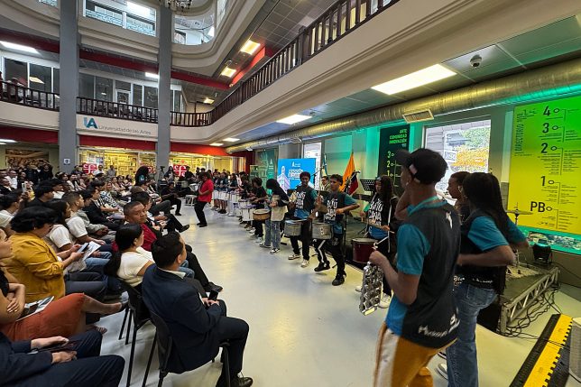 Le siguió La Batucada Popular, un proyecto que impulsa la Fundación Minkayni, aliada de la UArtes en la vinculación con la sociedad; sus jóvenes integrantes, provenientes de Socio Vivienda, brindaron una contagiante percusión de tambores. Y, casi al cierre, intervino Ritmo Legendario, grupo conformado por jóvenes músicos de la Cooperativa Sergio Toral e impulsado por la organización no gubernamental Desarrollo y Autogestión (DYA).