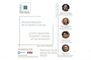 Con el tema “Descentralización de la Gestión Cultural. ¿Cómo desarrollar la gestión cultural en los territorios?”, el programa “Encuentros” que impulsa la Maestría de Políticas Culturales y Gestión de las Artes de la Universidad de las Artes llega este miércoles 3 de febrero de 2021 a su cuarta sesión. Se desarrollará a las 16h00, a través de la plataforma Zoom, y se transmitirá por las redes sociales de la UArtes y la Escuela de Posgrados.