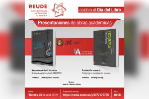 La Universidad de las Artes y la Universidad Nacional de Loja realizarán este viernes 23 de abril de 2021 la presentación conjunta de los libros Producción Musical Investigación y Pedagogía en Artes, de la autoría de los docentes UArtes Meining Cheung y Luis Pérez Valero, y Memoria de las I Jornadas de Investigación Musical, editado por Chemary Larez, Marianela Arocha y Verónica Pardo, de la UNL.