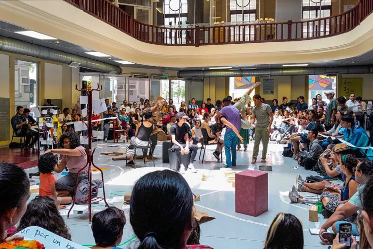 “Cuerpo-espacio-tiempo en la creación-investigación escénica” es la conferencia perfomática desarrollada al mediodía de hoy, miércoles 4 de octubre de 2023, en la Plaza Pública del MZ14 Centro de Producción e Innovación, en el marco de la VII edición del Encuentro Internacional de Investigación en Artes (ILIA). Participaron Lorena Toro, Vanessa Pérez, Diego Ortega, Christian Masabanda, Lorena Delgado, Carlos Cedeño y Bertha Díaz, todos miembros de comunidad UArtes.