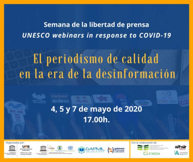 La actividad es organizada por la Cátedra UNESCO de Alfabetización Mediática y Periodismo de Calidad de la Universidad Autónoma de Barcelona (UAB). Cada día se presentará un tema específico para intercambiar ideas y debatir en una mesa redonda conformada por varios expertos. De esta manera se abordarán los retos a los que se enfrentan la libertad de prensa, el periodismo de calidad, los derechos a la información y la alfabetización mediática durante la actual crisis planetaria ocasionada por el coronavirus.