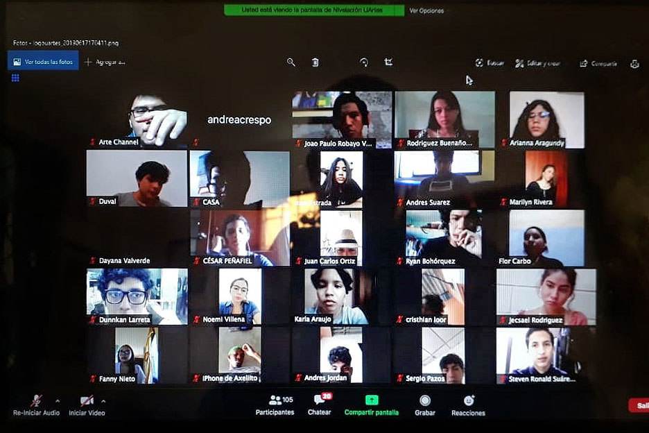 El miércoles 20 de mayo los estudiantes de Nivelación recibieron, mediante videoconferencia, la bienvenida e inducción. Lizbeth Dávila, jefa del Departamento, comentó a los más de 100 alumnos que se conectaron en cada una de las dos reuniones virtuales programadas lo complicado que fue el proceso. “Muchos de ustedes escribían preguntando qué iba a pasar porque mientras la Senescyt no daba paso a la asignación de cupos, no se podía hacer nada. Este se dio y los felicitó por obtener un cupo. Lograron pasar el proceso de admisión, el cual tiene sus etapas porque en la UArtes este paso no es como en las demás instituciones académicas; en la etapa previa hay audiciones y entrevistas”.