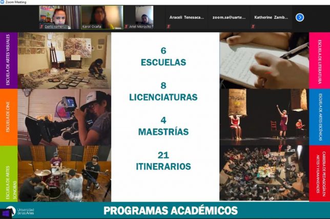 Con suma atención los estudiantes de tercero de bachillerato de la unidad educativa cuencana escucharon que en sus cinco años de gestión, la Universidad de las Artes cuenta con las Escuelas de Literatura, Cine, Artes Escénicas, Artes Sonoras y Artes Visuales, y que ha desarrollado ocho licenciaturas, así como tres maestrías y 21 itinerarios. También señaló que suman ya 222 los estudiantes que han obtenido y están por obtener su licenciatura. “En 2018 la UArtes graduó a 27 estudiantes; en 2019, a 111; y, en este 2020, a 84” se leía en la pantalla durante la videoconferencia y mientras el secretario académico daba cuenta de las 1.451 actividades que la universidad ha promovido para propiciar el acercamiento ciudadano al arte y la cultura. Entre los más destacados: InterActos, Libre Libro y Encuentro Internacional de Investigación en Artes, todos de libre acceso.