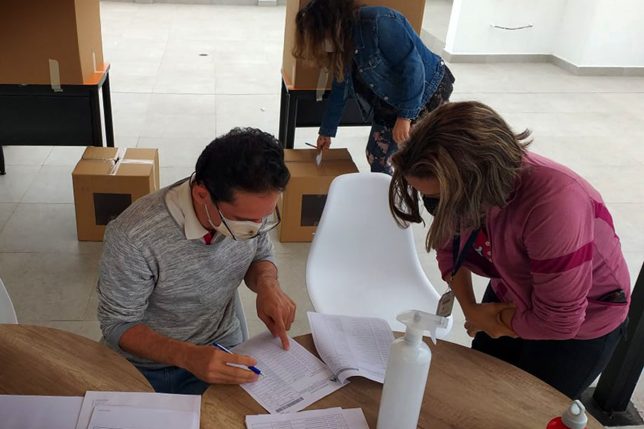 Me pusieron alcohol para la respectiva desinfección de manos, me tomaron la temperatura y pasé por tres bandejas de desinfección para los zapatos. Las mesas estaban numeradas, en el Excel que nos habían pasado con anticipación por correo estaba el número en el que me correspondía. Al llegar a la mesa, mostré mi carnet universitario, me dieron mis papeles e indicaron los biombos y el ánfora en la que debía depositarlos. Me preguntaron si llevé mi esfero, respondí afirmativamente. Entonces, con las papeletas en mano me dirigí a una mesa alejada de la vista de todos. Como último paso tuve que firmar tres hojas, cuando lo estaba haciendo alguien se acercó para votar, pero le pidieron que esperara un poco lejos porque yo todavía no terminaba.