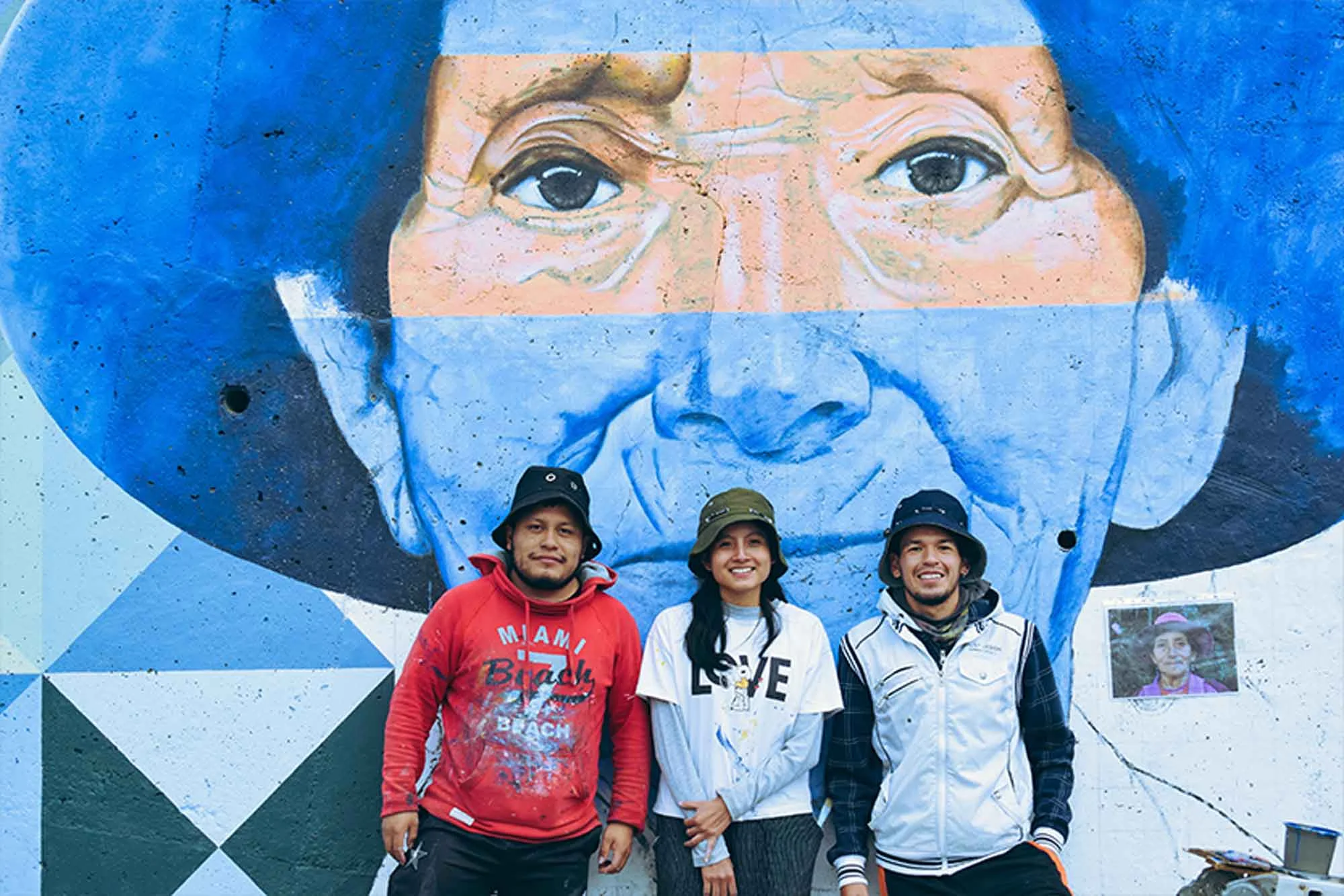 Con una amplia y completa investigación, en la que sustentaron los marcos teórico y jurídico, así como los objetivos general y específico, John, Melissa y Brayan tomaron fotografías a los adultos mayores de la zona y de entre ellos se eligió a una ciudadana de la comunidad de Paccha, cuyo rostro es el que sobresale. Por sus rasgos y vestimenta ella representa la identidad de la parroquia, anota nuestro entrevistado. Agrega que en el mural constan, además, unos triángulos de diferentes colores, que simbolizan la iconografía textil de la parroquia azogueña.