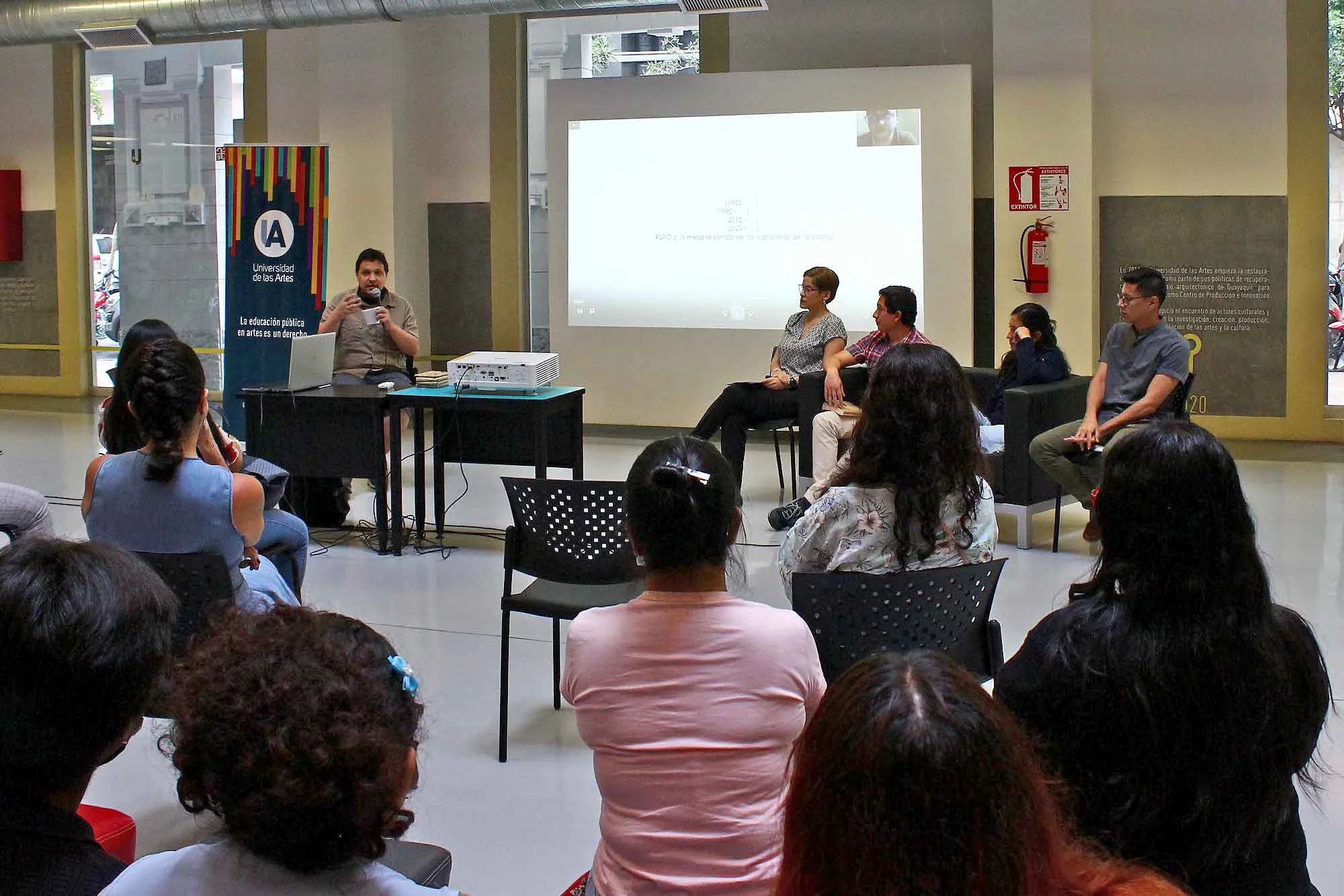 El conversatorio, titulado “Nuevas lecturas de la literatura ecuatoriana”, tuvo lugar el martes 7 en la Plaza Pública del Centro de Producción e Innvovación MZ14 de la UArtes. Intervino como moderador el docente Andrés Landázuri. Melanie Moreira y Laura Nivela se interesaron por la obra de Mónica Ojeda; José Gabriel Sánchez, por la de ficción de Alicia Yánez Cossíos; y, Carlos Cando, por la de Jorge Enrique Adoum.