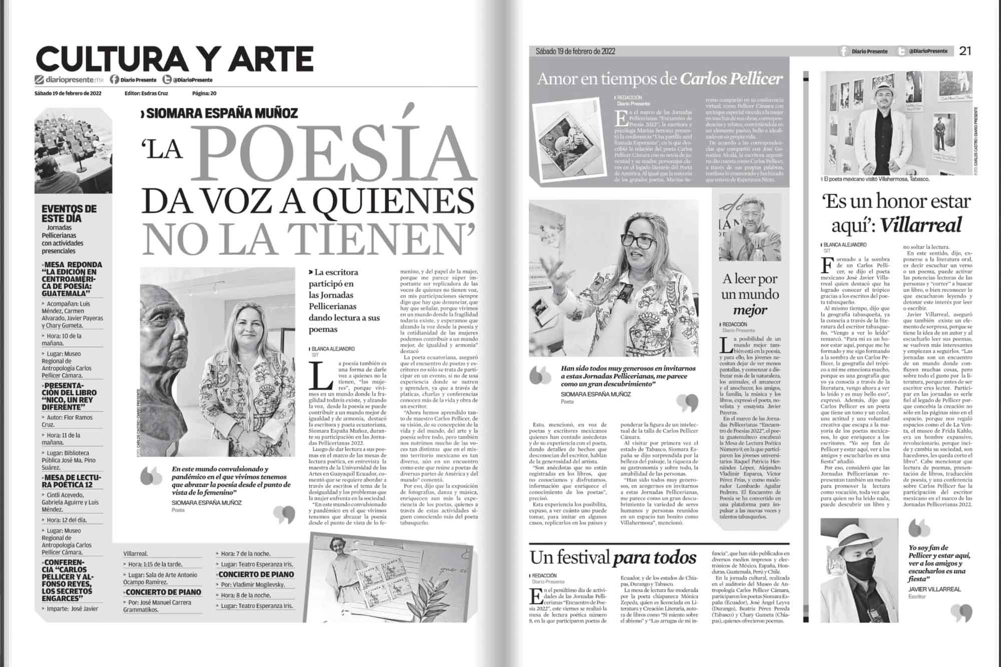 La poeta Siomara España Muñoz, docente de la Escuela de Literatura de la Universidad de las Artes, participó en el Encuentro Internacional de Poesía que se realizó, del 15 al 19 de febrero pasado, en la ciudad de Villahermosa del Estado de Tabasco, México. La actividad se desarrolló en el marco de las Jornadas Pellicerianas 2022 y junto a la catedrática ecuatoriana intervinieron autores de países como Guatemala, Honduras, Costa Rica, Puerto Rico y México.