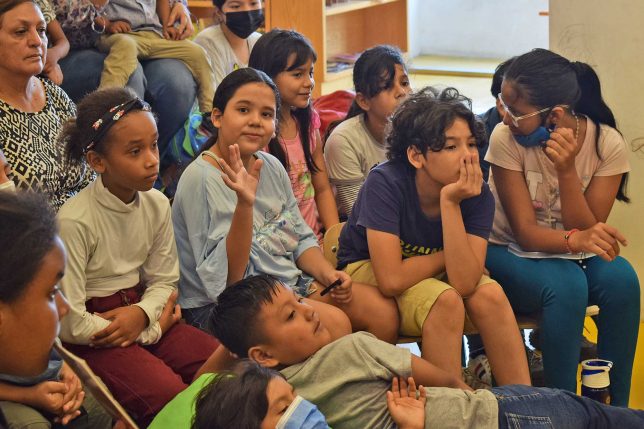 Casi mediodía del martes 12 de abril del 2022 y en la Sala Ría, de la Biblioteca de las Artes, niñas y niños –también jóvenes y adultos– buscaban el mejor lugar para seguir con detenimiento la anunciada lectura de textos infantiles con Manuel Peña-Muñoz, el escritor chileno a quien la Escuela de Literatura invitó a la UArtes gracias al relacionamiento y la colaboración que mantiene con la Embajada de Chile.