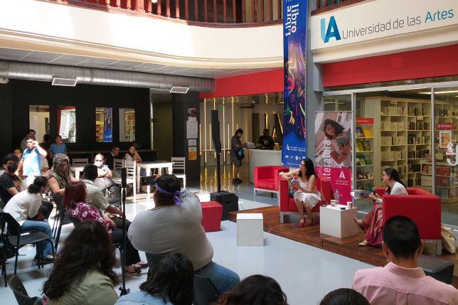 Antes de iniciar el diálogo con la escritora Cecilia Velasco, docente de la Universidad de las Artes, María Alejandra Zambrano advirtió que no se iba a dar el resumen de Hostal de mariposas, su más reciente obra. La idea es que vayan, la adquieran y la lean, dijo la directora de la Escuela de Literatura de la UArtes, señalando los stands de la feria de Libre Libro, el encuentro con las editoriales independientes que en este 2022 llegó a su edición 8 con la temática “Fronteras Invisibles”.