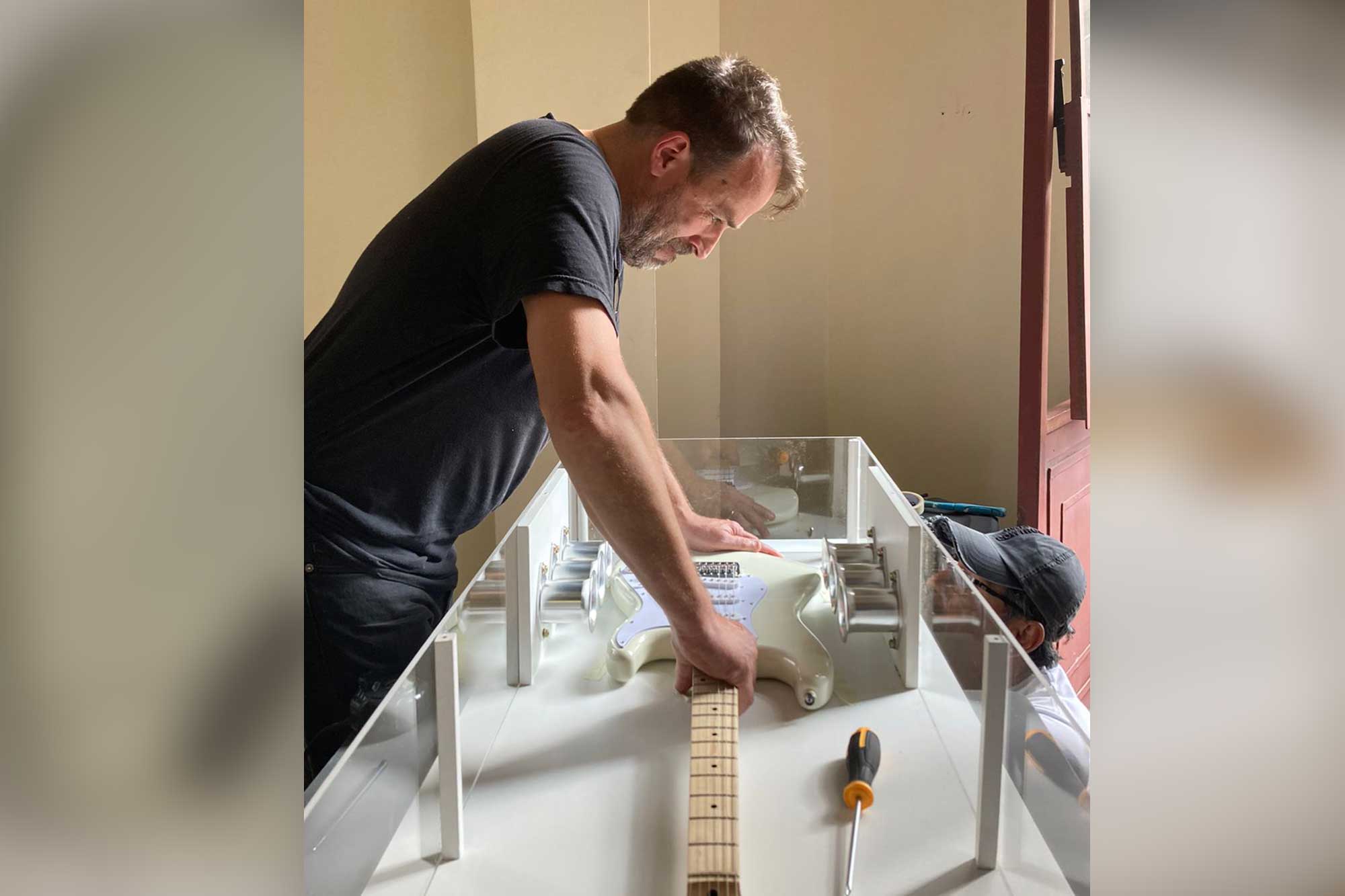 Se trata de la guitarra eléctrica Aeolin, misma que donó, dijo, con la esperanza de que no solo inspire a los estudiantes, sino también a los futuros artistas visitantes que tenga la UArtes para que, asimismo, donen más obras que fomenten una colección permanente para la universidad.