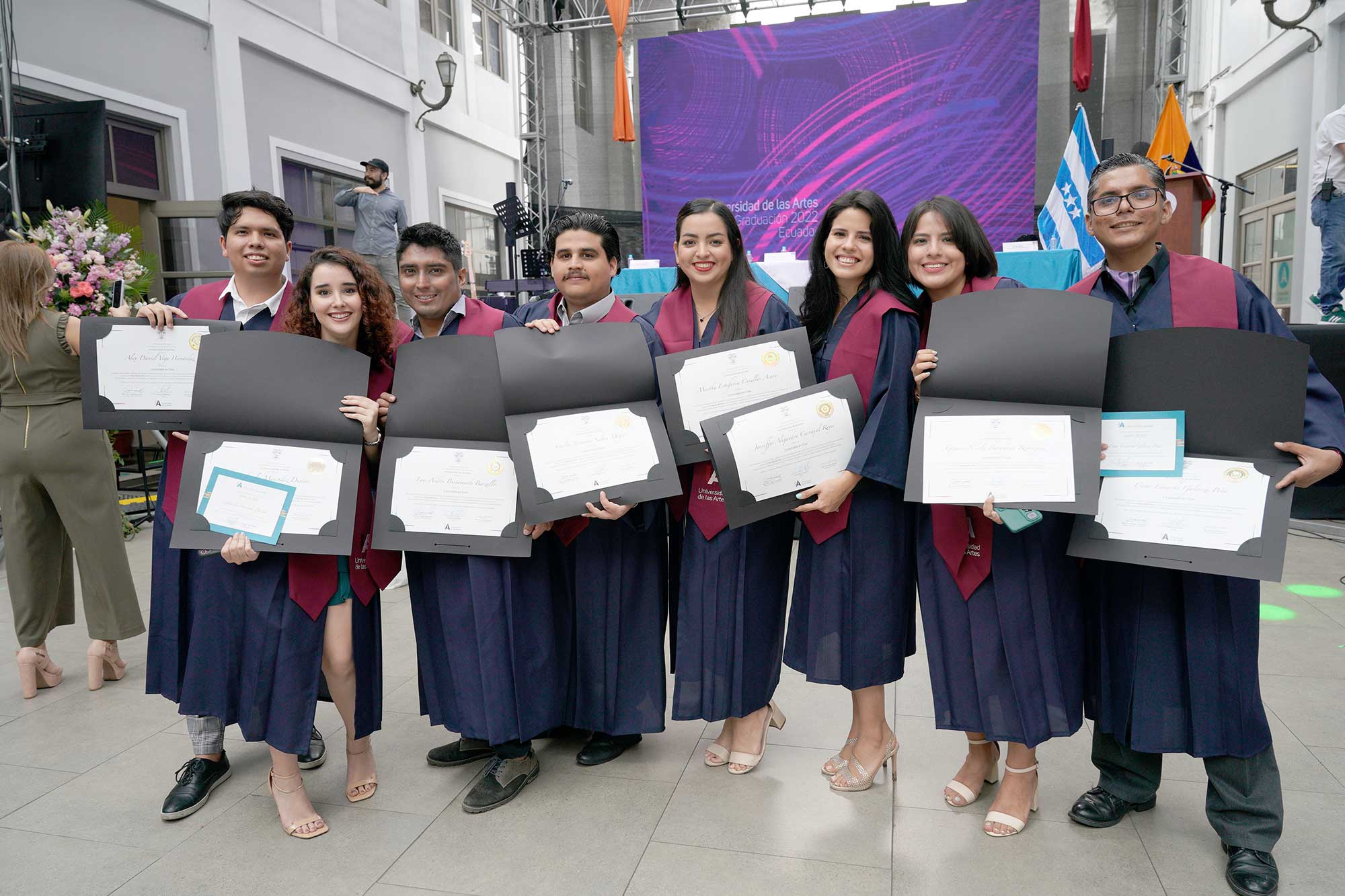Ciento sesenta estudiantes de las escuelas de pregrado y posgrado de la Universidad de las Artes recibieron, este sábado 10 de diciembre, sus títulos de tercero y cuarto nivel en dos ceremonias de graduación, en las que se entregaron también los reconocimientos cum laude, magna cum laude y summa cum laude, a quienes obtuvieron entre 9 y 9,7 en su promedio general de grado.
