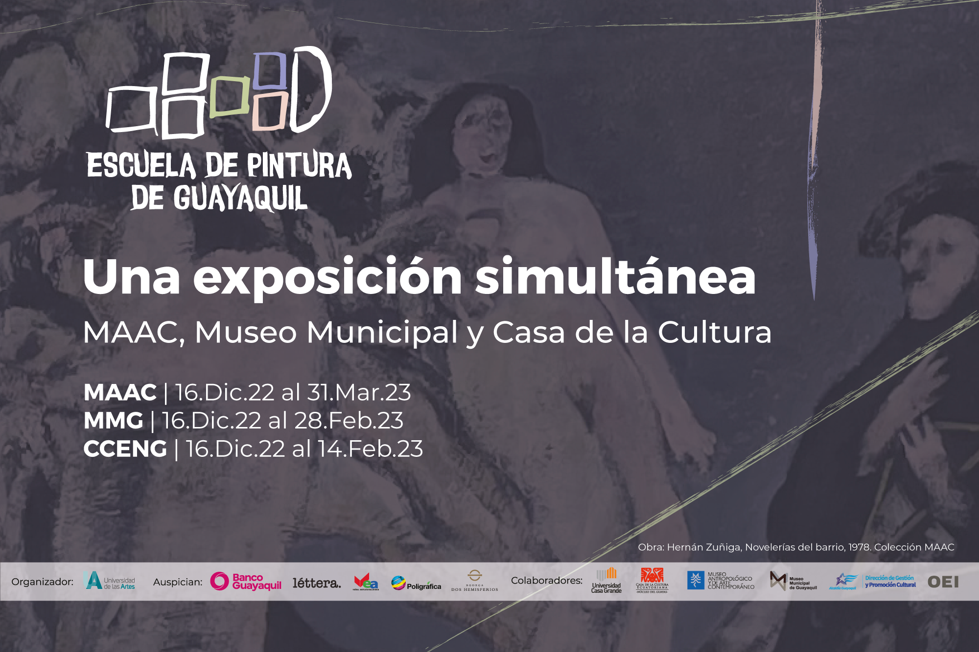 “Escuela de pintura de Guayaquil, 100 años de arte en el puerto” es la mayor exposición de arte guayaquileño de la historia. Tres museos simultáneos, más de 400 obras pertenecientes a más de 200 artistas, distribuidas en las tres sedes: Museo Municipal de Guayaquil, Casa de la Cultura Ecuatoriana Núcleo del Guayas y MAAC. Cuenta, además, con el apoyo de la Organización de Estados Iberoamericanos (OEI).