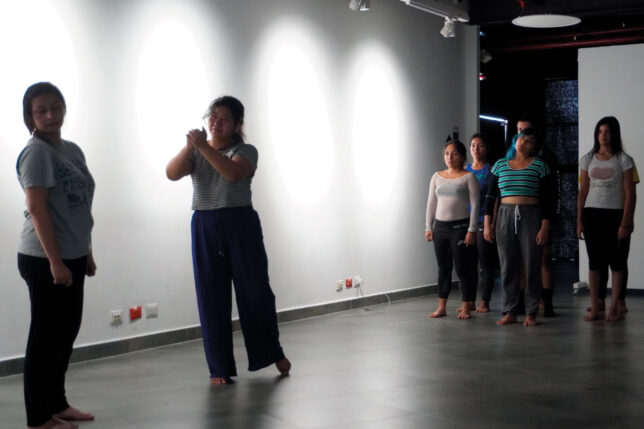 Narcisa Olvera: Es una exploración con un nuevo lenguaje en la danza para encontrar aristas que permitan contener el lenguaje corporal con la lengua de señas y que se complementen dentro de la escena. Ha sido un proceso de adaptación y re-adaptación en el que cada gesto y movimiento se convierten en elementos profundamente significativos para la coreografía. Es importante mencionar, además, que esta obra tiene como objetivo incluir a la comunidad sorda, para la cual casi no se crean propuestas que las incluyan. Junto a Giovanna (Ricaurte) hemos aprendido palabras y frases que tomamos y damos su respectiva importancia en la escena.