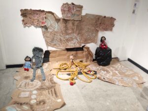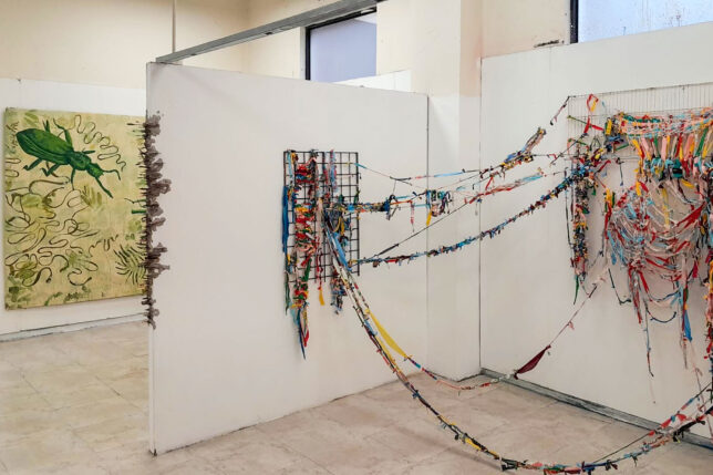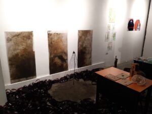 “Sinfonía de cuerpos flagelados” es otra de numerosas piezas presentes en El Telégrafo. Para su instalación Kevin Mendoza, quien cursa el séptimo semestre de Artes Visuales, utilizó una especie de tolda negra y en su interior un paisaje sonoro y visual de pies sobresaliendo de camas y camillas. Así abordó el contexto de la muerte de personas que han sido históricamente flageladas: niños, mujeres, personas negras y miembros de la comunidad LGBTIQ+. Su propuesta, en la materia de Procesos de creación, fue recrear el sentido del miedo en el último minuto de perder la vida en esas circunstancias. “En las morgues los pies se encuentran descubiertos y cuando los cuerpos no son identificados es en los dedos que se coloca una etiqueta. Quise visibilizar a quienes aún siguen en congeladores sin que se les haga justicia”.