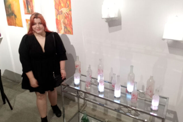 Una de las expositoras, Ariana Jarrín, contó que de la materia Procesos de creación I llevó a El Telégrafo sus trabajos “B1, B2 y B3” y una instalación de botellas a la que denominó “Venas”. La curiosidad que despiertan en el público sus propuestas la anima a buscar en la materialidad y jugar con la luz encapsulada, dijo, revelando su gusto por hacer uso de las conexiones; de allí que a las botellas de cristal de su muestra introdujo un hilo rojo para recrear los vasos sanguíneos del cuerpo humano.