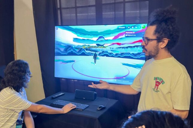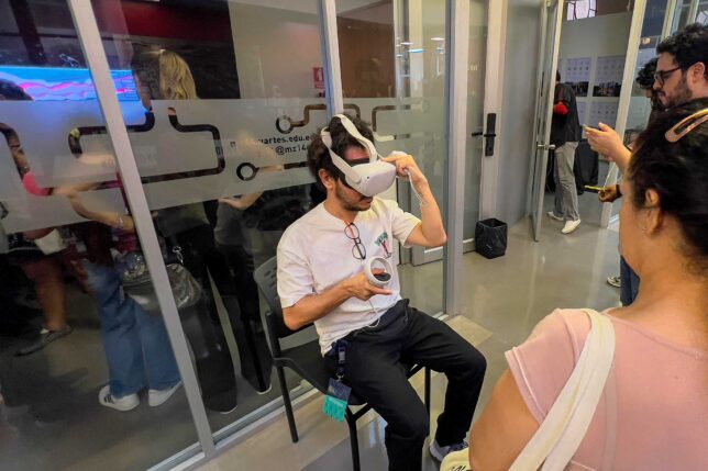 En la segunda instalación, “Realidad virtual: paisajes en tramas cocreativas”, los asistentes fueron transportados a un entorno virtual en el que el paisaje se reinventa como un ente cultural moldeado por la interacción entre la naturaleza, la tecnología y la humanidad. A través de imágenes, sonido y realidad virtual, esta obra invitó a reflexionar sobre nuestras relaciones con el entorno natural y cómo nuestras acciones lo transforman. Evocó, además, la resiliencia de la naturaleza, instando a considerar el impacto del desarrollo urbano sobre los ecosistemas; sus creadores, de la Institución Universitaria ITM (de Medellín, Colombia) indicaron que su proyecto, realizado en Spatial, contaba con un código QR para vivir la experiencia planteada.
