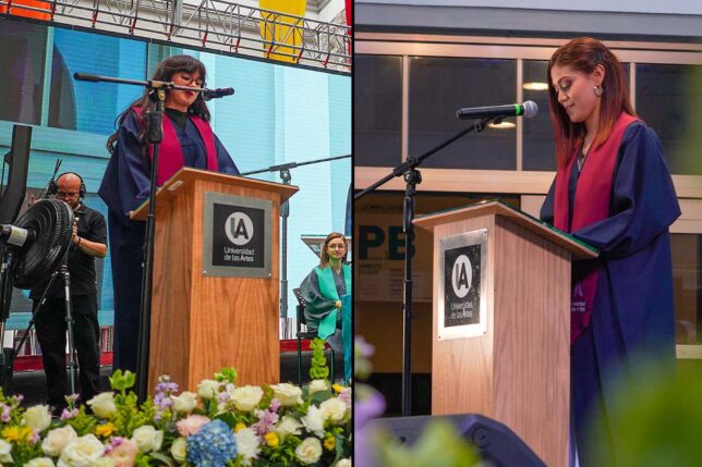 Mariam Ibarra Rojas, de Literatura, e Ivonne Morales Cornejo, de Creación Teatral, fueron junto a Edmundo Vélez Alcívar las graduadas con los mejores promedios, lo cual les hizo merecer el reconocimiento suma cum laude. Intervinieron en la primera y segunda ceremonia de graduación, respectivamente, el viernes 13 de diciembre en el Pasaje Illingworth del antiguo Palacio de la Gobernación, nuestra sede matriz.